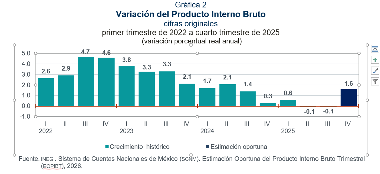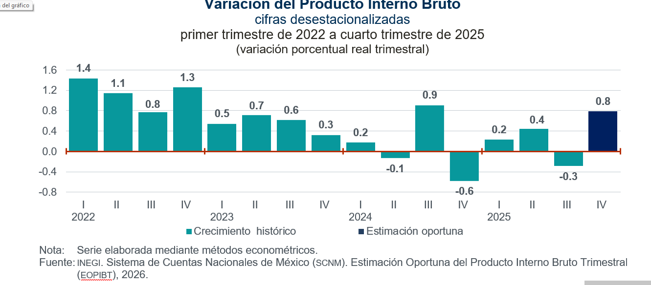 En el cuarto trimestre de 2025 y con cifras ajustadas por estacionalidad, los resultados de la Estimación Oportuna del Producto Interno Bruto Trimestral (EOPIBT) indican que el pib creció 0.8 % en términos reales, respecto al trimestre inmediato anterior.  A tasa anual, el pib oportuno incrementó 1.6 por ciento.
