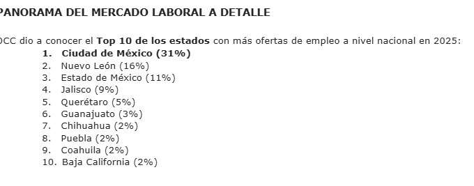 Del lado de la oferta de talento, más de 13 millones de personas se encuentran registradas en OCC para buscar empleo durante 2025, un universo mayoritariamente profesionalizado, con estudios universitarios y experiencia en áreas clave para la economía nacional. Este cruce entre alta demanda empresarial y una base amplia de candidatos confirma que el empleo formal sigue siendo un eje estratégico para el desarrollo económico del país.
